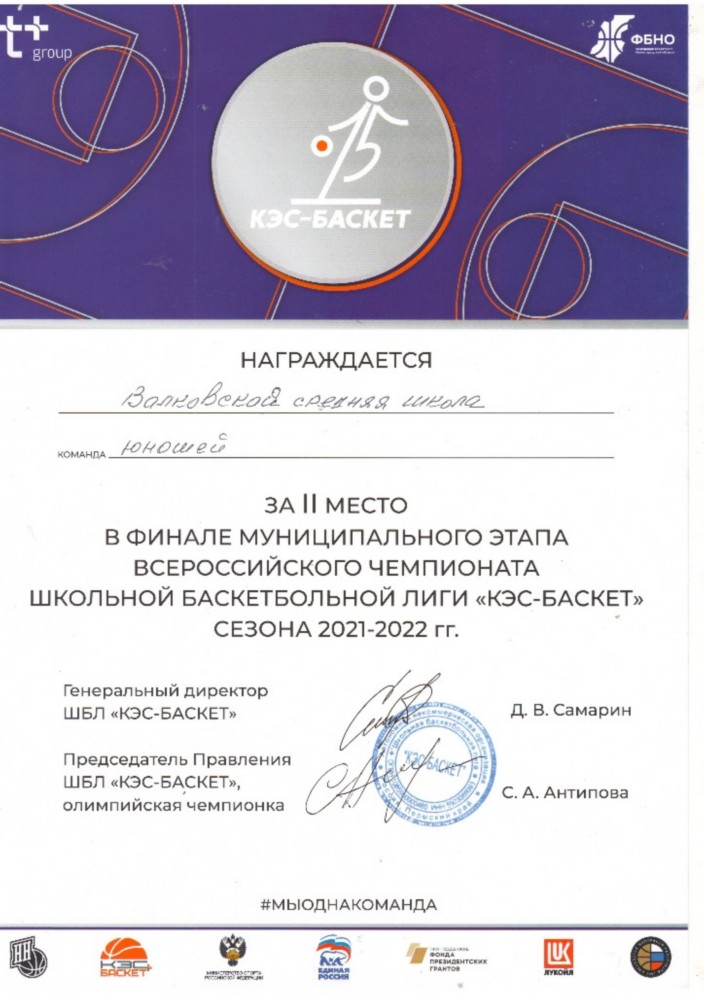 В соответствии с Положением о проведении Чемпионата Школьной баскетбольной лиги «КЭС-БАСКЕТ» в Нижегородской области среди команд общеобразовательных организаций сезона 2021-2022 гг., в целях укрепления здоровья учащихся, воспитания потребности в здоровом образе жизни обучающихся, популяризации баскетбола в Лысковском округе наши учащися заняли 2 место.